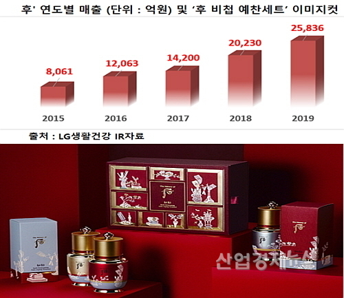 LG생활건강이 지난달 공시한 IR자료에 따르면 ‘후’의 성장세는 가히 독보적이다. 지난 2015년 8061억 원이었던 매출액이 2016년 1조2063억으로 1조를 돌파하더니 불과 2년만인 2018년엔 2조230억으로 2조 시대를 열었다.