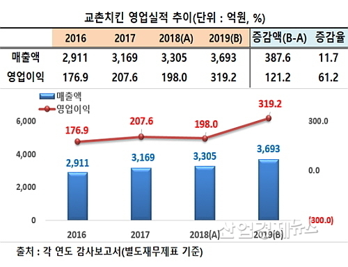 이 회사 감사보고서에 따르면 교촌치킨은 지난해 별도재무제표기준 3693억 원의 매출을 올려 전년도 3305억 대비 약 11.7% 증가했다. 지난 2014년 매출 2911억과 비교하면 약 26.8% 신장해 연평균 8.9%씩 꾸준한 성장세를 구가했다.