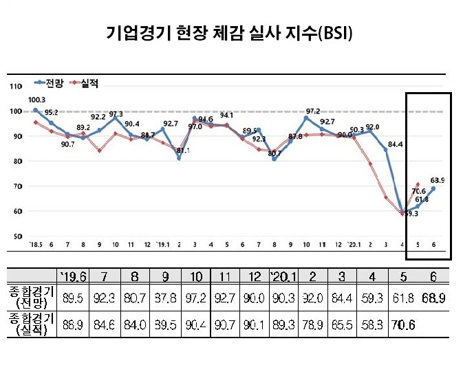 [산업경제뉴스 박진경 기자] 코로나19로 내리막길을 달리던 기업현장의 체감경기가 5월에 들어오면서 상승세로 반전했고 6월 전망도 상승 추이를 보일 것으로 예상됐다. 하지만 수치가 100보다 낮은 60~70에 머물러 여전히 기업들의 어려움이 계속되고 있는 것으로 나타났다.