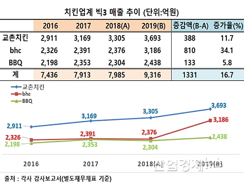 2019년 매출 증가율 ‘bhc치킨 34.1% vs 교촌 11.7%, BBQ 5.8%’ 순