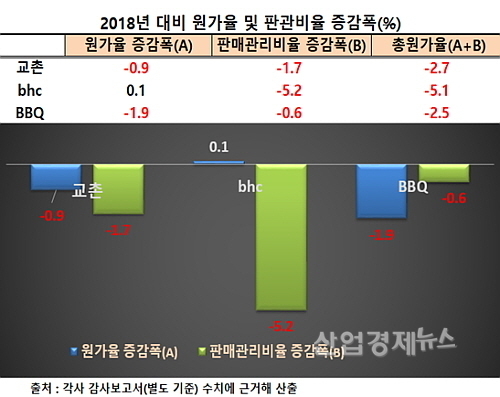 교촌이 2018년 94.0%에서 지난해 91.4%로 2.6%포인트 줄었고, BBQ 2.5%P, bhc 5.1%P 씩 3사 모두 하락함으로써, 전년대비 영업이익 급증세를 이끈 것으로 분석된다.