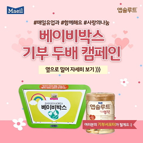 이 캠페인은 소비자가 기부 링크를 통해 앱솔루트 명작 1캔을 구매하면 매일유업이 같은 제품 2캔을 베이비박스에 기부하는 형태다. ‘단 한 명의 아이도 소외되지 않고 건강하게 자랄 수 있어야 한다’는 기업 철학을 바탕으로 돌봄의 사각지대에 놓인 아기를 지원하겠다는 취지다.