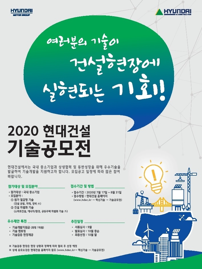 현대건설은 7월 17일부터 8월 31일까지 국내 중소기업을 대상으로 ‘2020 현대건설 기술공모전’ 응모작을 모집한다고 밝혔다.