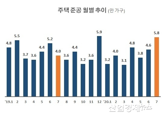 국토교통부가 조사한 '7월 주택 준공 실적'에 따르면 올해 7월에 준공한 주택은 전국적으로 5만7663 가구로 작년 7월 4만 446가구보다 42.6%나 증가한 것으로 나타났다.