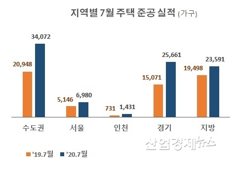 이러한 증가세는 특히 수요가 크게 부족한 수도권에서 두드러졌다. 수도권의 7월 준공실적은 3만4072 가구로 지난해보다 62.7%나 증가했다.
