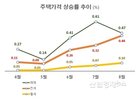 8월 주택매매가격 상승율은 0.47%로 전월 0.61% 보다 0.14%포인트 떨어졌다. 줄곧 상승하던 곡선이 크게 꺾인 모습이다.