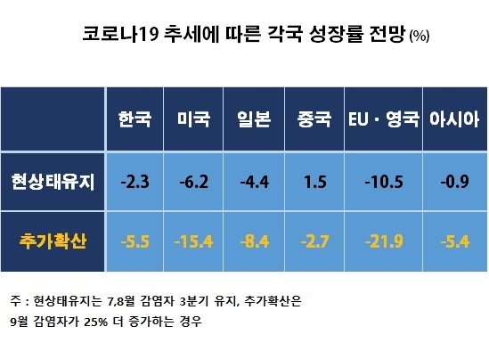 코로나19가 추가 확산될 경우, 한국의 경제성장률도 -5.5%까지 떨어 지지만, EU와 영국은 무려 -21.9%로 떨어지고 미국도 -15.4%로 경제성장률이 떨어질 것이라는 추정이다. 1930년 대공황 당시 미국의 경제성장률은 - 12.9%였다.