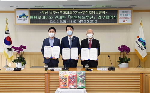 부산 남구청 5층 대회의실에서 진행된 이날 협약식에는 롯데제과 김대우 상무(양산공장장), 박재범 남구청장, 권율정 부산지방보훈청장 등 코로나-19 상황을 감안해 최소 인원만 참석했다.