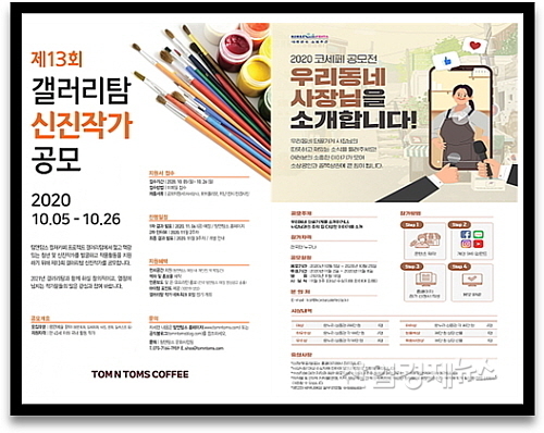 커피전문점 탐앤탐스는 신진·청년 작가 발굴, 육성을 위한 ‘제13회 갤러리탐(耽) 신진작가 공개 모집’을 ▲한국화 ▲서양화 ▲사진 ▲판화 ▲일러스트 ▲기타(입체회화 등) 분야별로 오는 26일까지 진행한다.