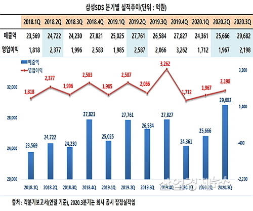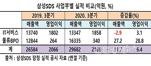 삼성SDS가 최근 공시한 잠정영업실적에 따르면 연결재무제표 기준 올 3분기 매출은 약 2조9682억 원으로 지난해 3분기 2조6584억 대비 3098억이 늘어 11.7%가량 신장했다.