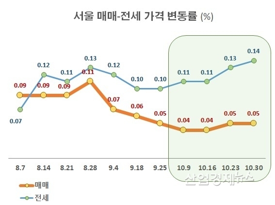 하지만 전세가격은 계속 가파른 상승세를 보이며 매주 상승률을 높여 10월 넷째주 0.14%의 상승률을 보였다. 최근 상승세가 제일 가파랐던 8월말 0.13%보다 더 높은 상승세를 보였다.