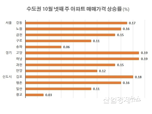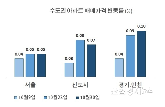 부동산114에 따르면 10월 넷째주 수도권 아파트 가격 주간 상승률은 서울이 0.05%에 그친데 반해, 신도시는 0.07%로 서울보다 높은 상승률을 보였고, 경기.인천 지역 아파트가격은 0.10%나 올라 서울 상승률의 두 배에 달했다.