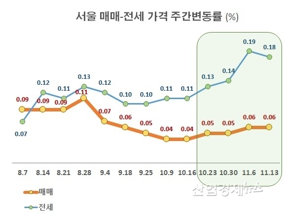 서울의 전세가격 주간 상승률은 11월 첫째 주 0.19%에 이어 둘째 주에도 0.18%로 전례없는 급상승 추이를 보이고 있다. 매매가격도 10월 말부터 상승세로 전환해 11월 첫째 주, 둘째 주 0.06% 상승했다. 하지만 전세가격 상승률에 비하면 3분의 1 수준이다.