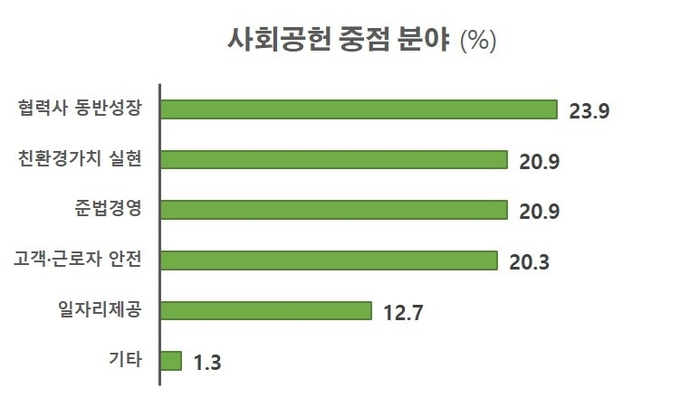 한편, 기업들이 사회적 가치를 실현하기 위해 가장 중점을 두는 부분은 '협력사와 동반성장' 인 것으로 조사됐다. 기업들의 23.9%가 협력사와의 협력과 협력사의 성장에 가장 큰 비중을 두고 있다고 대답했다.