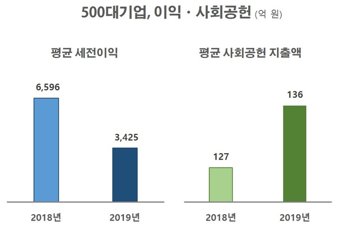 전국경제인연합회(이하 전경련)는 우리 대기업의 사회공헌 활동을 파악하기 위해 매출 500대 기업의 2018년과 2019년 세전이익과 사회공헌 지출액을 조사한 결과를 30일 발표했다.