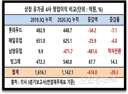 4사의 3분기 누적 합산영업이익은 1142.1억 원으로 전년 동기 1616.1억 대비 474억 줄어 약 29.3% 급감했다. 빙그레만 67.7억이 늘어 약 14.7% 증가했을 뿐, 남양유업(–471.7억, 적자전환), 롯데푸드(–7.1%), 매일유업(-4.0%) 등 3사 모두가 합산손익을 후퇴시키는데 기여했다.