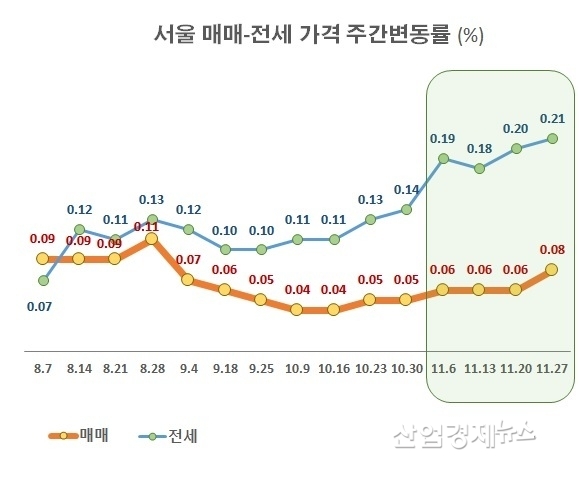 서울 전세가격 주간 상승률은 11월 넷째 주 0.21%로 7년만에 최고 상승률을 기록하며 폭발적인 상승세를 한달 째 이어가고 있다.
