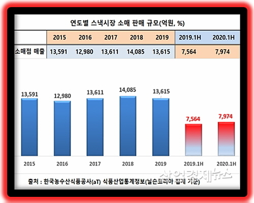 [산업경제뉴스 민경종 기자] 지난해 상반기(2020년) 스낵시장(소매판매) 규모가 최근 4년간 펼쳐온 제자리걸음을 뛰어 넘는 성장을 펼친 것으로 조사돼, 연간으로도 이 같은 추세를 잇기 위한 업계의 막판 스퍼트 결과가 주목을 받고 있다.