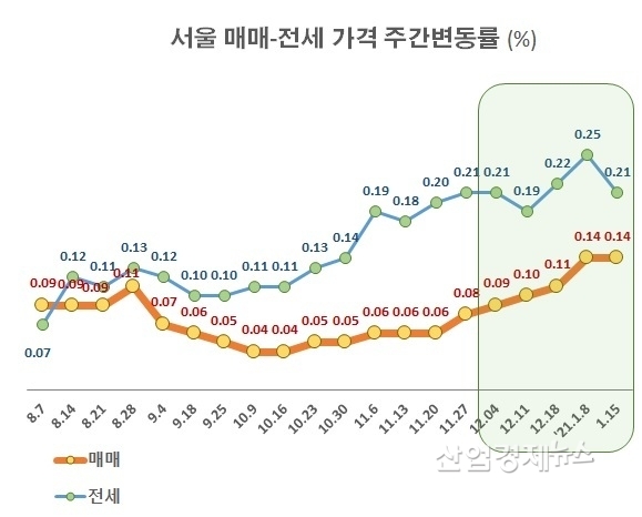서울 아파트의 전세가격도 지난해말 0.22%까지 주간변동률이 상승했고, 올해로 들어오면서 0.25%로 또 한 계단 올라섰다. 하지만 셋째주로 들어서면서 0.21%로 상승세가 주춤했다.
