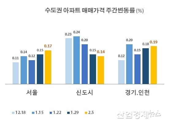 한편, 서울과 신도시, 경기인천 등 수도권의 아파트가격은 지역별로 차이를 보였다. 서울은 매매가격이 급하게 오르고 있지만, 분당, 중동, 파주운정 등 신도시 지역의 상승세는 지난 1월 중순 0.24%까지 상승폭을 올렸지만 지난 주에는 0.14%로 상승세가 감소하고 있다.