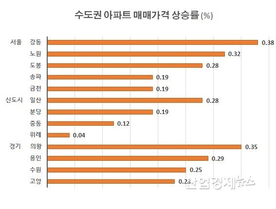 서울 아파트 가격은 강동 0.38%, 노원 0.32%, 도봉 0.28% 등 외곽지역이 상승세를 이끌었다. 강동 둔촌주공, 명일 래미안, 고덕그라시움이 한 주만에 1500~5000만원 올랐다. 또 노원 상계주공, 중계 양지대림, 하계 한신청구 등도 1250~3000만원 올랐고, 구로 대림1차, 오류 영풍, 구로 두산 등이 1000~2000만원 올랐다.