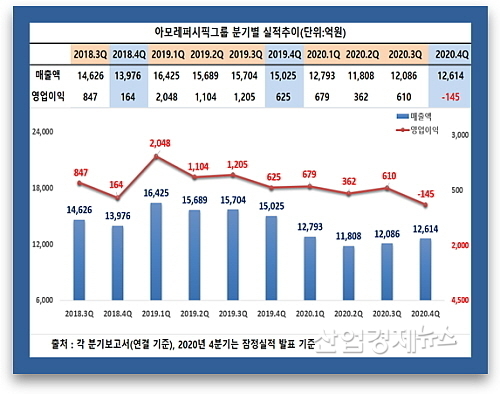 [산업경제뉴스 민경종 기자] LG생활건강과 더불어 국내 뷰티시장을 이끌고 있는 아모레퍼시픽그룹(아모레G)의 지난해 4분기 실적이 전년 동기와 비교해 매출은 줄고, 영업이익마저 적자로 돌아선 것으로 밝혀졌다.