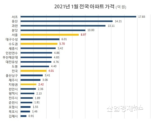 [산업경제뉴스 문성희 기자] 전국 아파트의 평균 가격이 4억원을 넘어섰다. 한국부동산원의 주택통계조사에 따르면 지난해 12월 3억 9600만원으로 4억원 코밑까지 접근했던 전국 아파트 평균 가격이 올해 1월 드디어 4억 100만원으로 집계되면서 4억원 시대가 열렸다.
