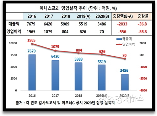이니스프리의 지난해 매출은 3486억 원으로 전년도 5519억 대비 36.8%나 감소했고, 손익 상황은 이보다 더 심각해, 달랑 70억 원의 영업이익을 내는데 그침으로써 전년도 626억 보다 무려 88.8%나 급감했다.