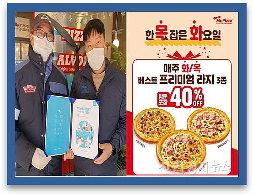 미스터피자는 올 연말까지 매주 화요일과 목요일에 방문포장 시 프리미엄 피자 베스트셀러 3종(L)에 대해 40% 할인 판매하는 내용의 ‘한몫 잡은 화요일’ 프로모션을 진행한다.
