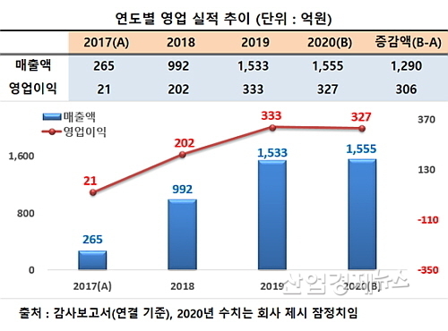 이에 힘입어 2017년 265억 매출에 21억 원의 영업이익에 그쳤던 회사 실적이 2018년 992억과 202억, 2019년엔 매출 1533억(영업이익 333억) 원으로 급성장했고,