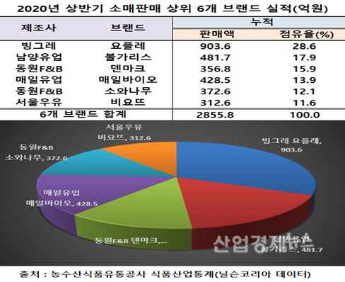 상위 6개 브랜드 중 요플레와 매일바이오 등 1위 4위 브랜드 제품은 방긋 웃었지만 나머지 4개 브랜드는 판매액이 뒷걸음해 희비가 교차했다.