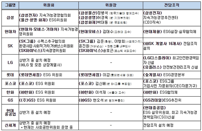 10대 그룹 중 7개사는 ESG위원회를 설치하거나 기존 위원회를 확대 개편했다. 엘지, 현대중공업 등 두 곳은 올해 상반기 중 설치예정인 것으로 조사됐다.