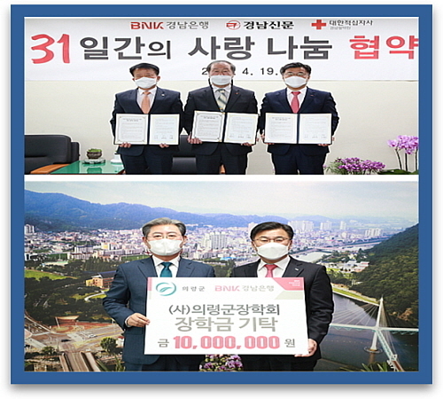 이뿐만이 아니다. 지난 4일에는 최 행장이 의령군청을 방문해 오태완 군수에게 ‘장학금 기탁 증서’를 전달했다. BNK경남은행이 기탁한 장학금 1000만원은 (사)의령군장학회가 추천한 성적 우수 청소년들에게 장학금으로 지원될 예정이다.