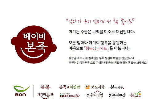 [산업경제뉴스 민경종 기자] 맞춤형 유동식 생산 전문 기업 순수본㈜의 프리미엄 영유아식 브랜드 베이비본죽이 오는 30일까지 ‘착한맘 세트 기부 캠페인'을 마련하고 그 행사의 자리로 초대했다.