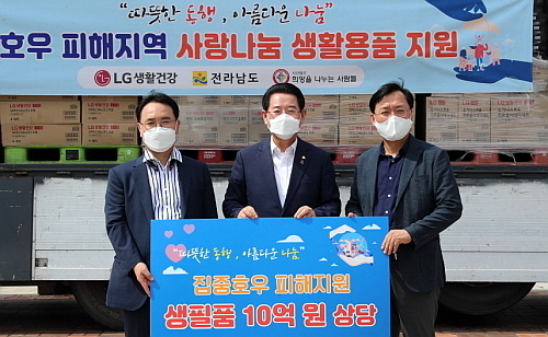 김영록 전남도지사는 “최근 집중호우로 힘든 시기를 보내는 도민들에게 따뜻한 위로와 함께 생필품을 보내준 LG생활건강과 희망을나누는사람들에게 감사의 말씀 드린다”고 말했고,