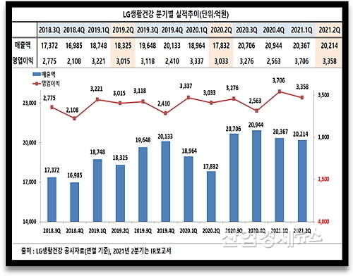 LG생활건강이 밝힌 연결재무제표 기준 올 2분기 잠정실적(IR자료)에 따르면 전사 매출은 2조214억 원으로 전년 동기 1조7832억 대비 2382억이 늘어 약 13,4% 증가했다. 이는 역대 2분기 매출액 기준 최대치고 전체 분기대비로는 4번째에 해당하는 수치다.