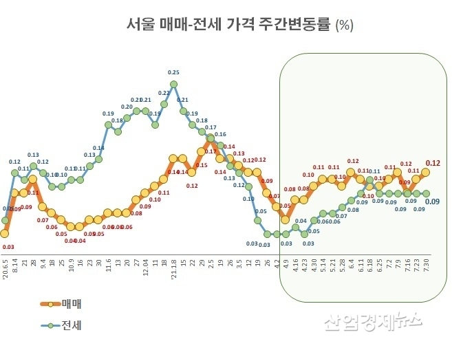 하지만, 서울시장 선거후 매매값이 급격히 상승하자 전세값도 따라 올랐고 6월부터 7월까지 주간상승률 0.09%를 유지하고 있다.
