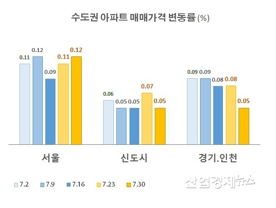 부동산114에 따르면 서울 아파트의 주간상승률은 7월 둘째주 0.09%로 낮아졌지만, 셋째주에는 0.11%로 상승폭을 키웠고 넷째주에는 0.12%로 상승세가 더욱 가파라졌다.