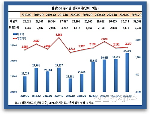 삼성SDS가 최근 공시한 잠정영업실적(IR자료)에 따르면 연결재무제표 기준 2분기 매출은 약 3조2509억 원으로 지난해 2분기 2조5666억 대비 6843억이나 늘어 26.7%가량 급증했다.