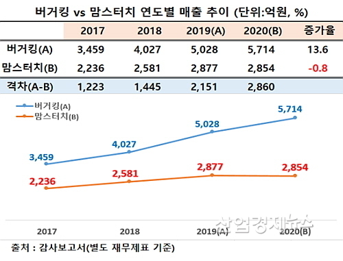 매출증가율, ‘버거킹 13.6% vs 맘스터치 -0.8%’...버거킹이 14.4%P 앞서
