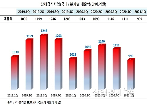 CJ프레시웨이가 공시한 매 분기별 IR보고서에 따르면 지난해 단체급식사업 연매출은 4360억 원으로 전년도 4678억 대비 318억 원이 줄어 약 6.8% 감소했다.