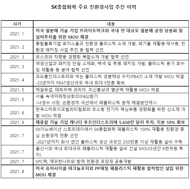 SK종합화학은 화학적 재활용 분야의 글로벌 선도 기술 확보와 더불어 3R(Recycle, Replace, Reduce)에 기반한 다양한 친환경 솔루션 역량을 기반으로 2025년에는 그린 사업으로만 EBITDA 기준 6천억원 이상을 창출하겠다는 목표다. 나아가 2027년에는 회사가 연간 생산하는 플라스틱 물량 100%에 해당하는 250만톤 이상을 재활용 할 계획이다. 이와 더불어 100% 재활용 할 수 있는 친환경 플라스틱 제품만을 생산할 계획이다.