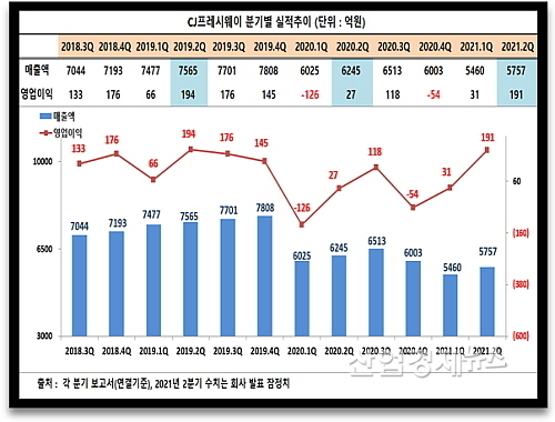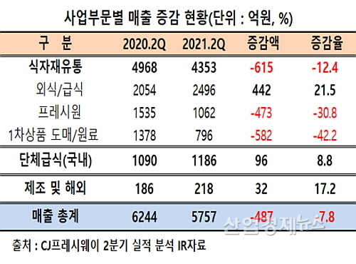 [산업경제뉴스 민경종 기자] CJ그룹 식자재 유통 및 단체급식 전문기업 CJ프레시웨이가 올 2분기 매출이 감소하는 와중에서도 영업이익이 약 7배 급증, ‘어닝서프라이즈’를 시현한 것으로 밝혀졌다.