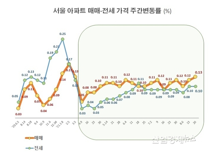 매주 서울과 수도권의 아파트가격을 조사하고 있는 부동산114의 보고서에 따르면, 지난 주 서울 아파트가격의 주간 상승률은 0.13%를 기록했다.