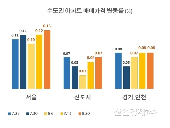신도시와 마찬가지로 7월에 상승폭을 줄였던 경기인천 지역의 아파트가격도 8월 들어 오면서 0.08%로 다시 상승한 것으로 조사됐다.