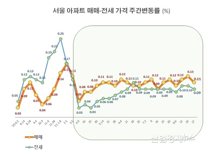 그리고 이러한 매물실종 흐름에 따라 매매는 0.05%에서 0.13%까지 가격상승률이 커졌으며, 전세는 0.03%에서 0.10%로 다시 상승세를 타고 있다.