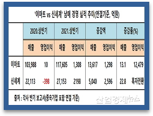 이마트가 올 상반기 1308억 원의 영업이익을 시현 지난해 상반기 10억 대비 1298억이 순증하며 무려 1만2479% 증가율을 시현했지만 신세계는 전년도 398억 영업적자에서 올 상반기 2198억 원의 영업이익을 시현하면 흑자전환에 성공한 것.