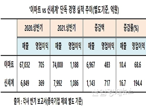 이를 양사의 반기보고서에 의거해 상반기 매출과 손익상황을 좀 더 구체적으로 살펴보면 외형성장을 이뤄낸 이마트의 경우 자체사업(별도재무제표)의 매출 순증액 6967억 원에다,