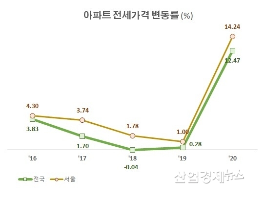 2017년과 2018년 입주물량이 많았을 때 아파트 전세가격 변동률은 -0.04%로 가격이 떨어지기까지 했다. 하지만 2019년부터 입주물량이 줄어들면서 전세가격 변동률은 커지기 시작해 2020년에는 12.47%로 역대 최고의 상승률을 기록하기도 했다.