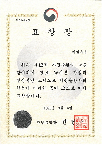 9월 6일 ‘제13회 자원순환’의 날을 맞아 환경부에서 주최한 ‘2021 포장재 및 일회용품 감량 우수사업자 공모’에서 포장재·일회용품 감량 및 재활용 촉진 우수사업자로 선정되며 환경부장관상 수상의 영예를 안았다고 지난 24일 밝힌 것.